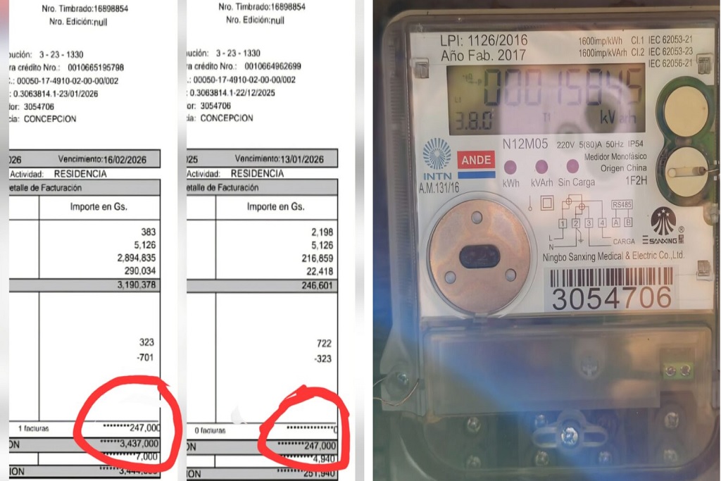 Se trata de Rosada Báez Ávila, quien afirmó que tras haber abonado el mes anterior una factura de G. 247.000, recibió recientemente un nuevo comprobante por G. 3.437.000, monto que considera imposible de pagar y totalmente desproporcionado para su consumo habitual.